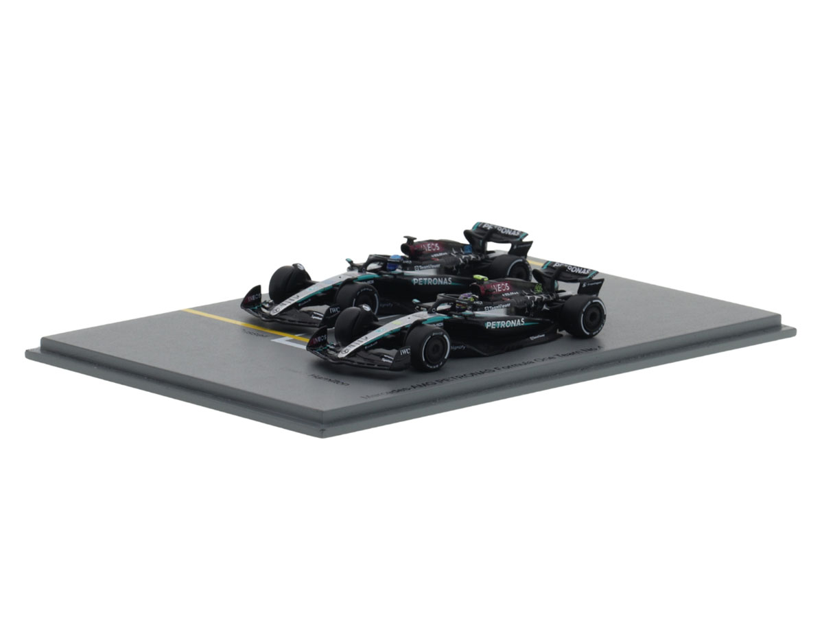 Miniatura Set Fórmula 1 Mercedes AMG Petronas W15 Las Vegas GP G.Russell + L.Hamilton 2024 1:64 Spark